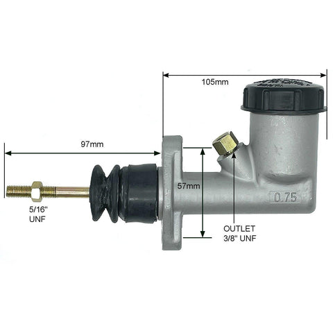 This Girling-style cast aluminium brake and clutch master cylinder offers robust performance and reliability. Featuring a 5/16" UNF pushrod thread, 2 1/4" (57mm) mounting hole centres, and a 3/8" UNF outlet thread, it ensures compatibility with various systems.