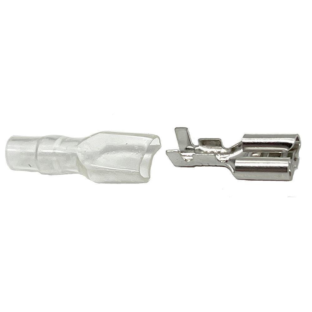 These 1/4" female spade terminals and covers are essential for creating secure and reliable electrical connections. Made from plated brass, the 'F' crimp terminals ensure excellent conductivity and durability. The clear PVC slide-over covers provide insulation and protection against the elements, ensuring long-lasting performance. This pack contains 100 terminals and 100 matching PVC covers.