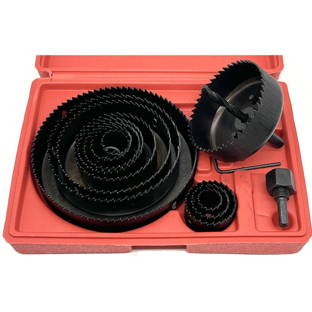 A 16-piece hole saw set with a wide range of sizes, two arbors, assembly tools, and a durable case.