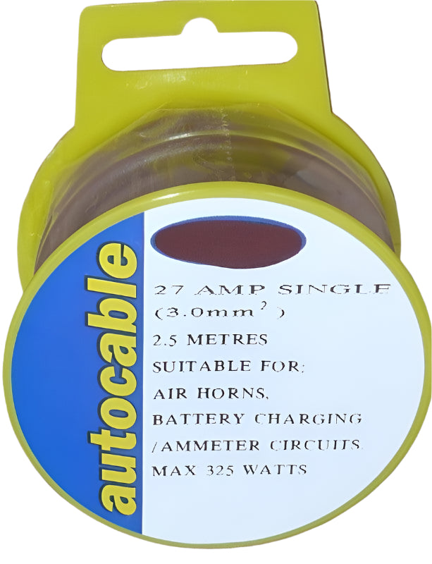 This 27A single core cable reel provides 2.2 meters of flexible black cable, ideal for various automotive applications. The 44/0.3mm (3.0mm²) cable supports a maximum load of 325 watts, making it suitable for charging circuits, ammeters, and air horns.