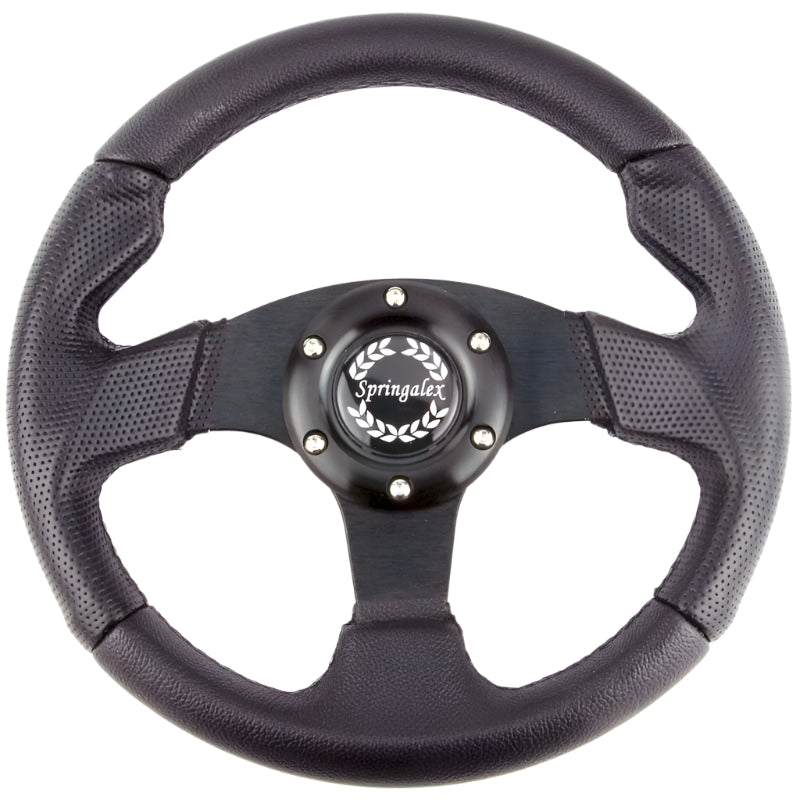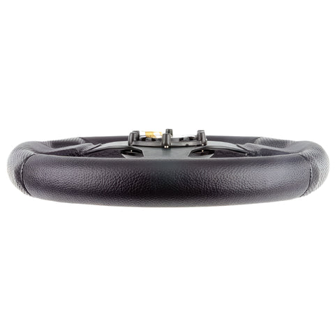 Tough, textured rim, sculptured for comfort over a brushed, black anodised slightly dished aluminium frame 3.7mm thick.
