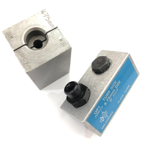 This professional die set is designed for creating precise DIN (Deutsche Industrie Norm) flares on 4.75mm (3/16") O.D. brake pipes. Compatible with professional brake pipe flaring tools, this set includes pipe clamps and a single DIN die block to ensure accurate and reliable flaring. The DIN flare profile is commonly used in automotive and other hydraulic systems. This die set is a crucial tool for creating leak-free, high-pressure connections.