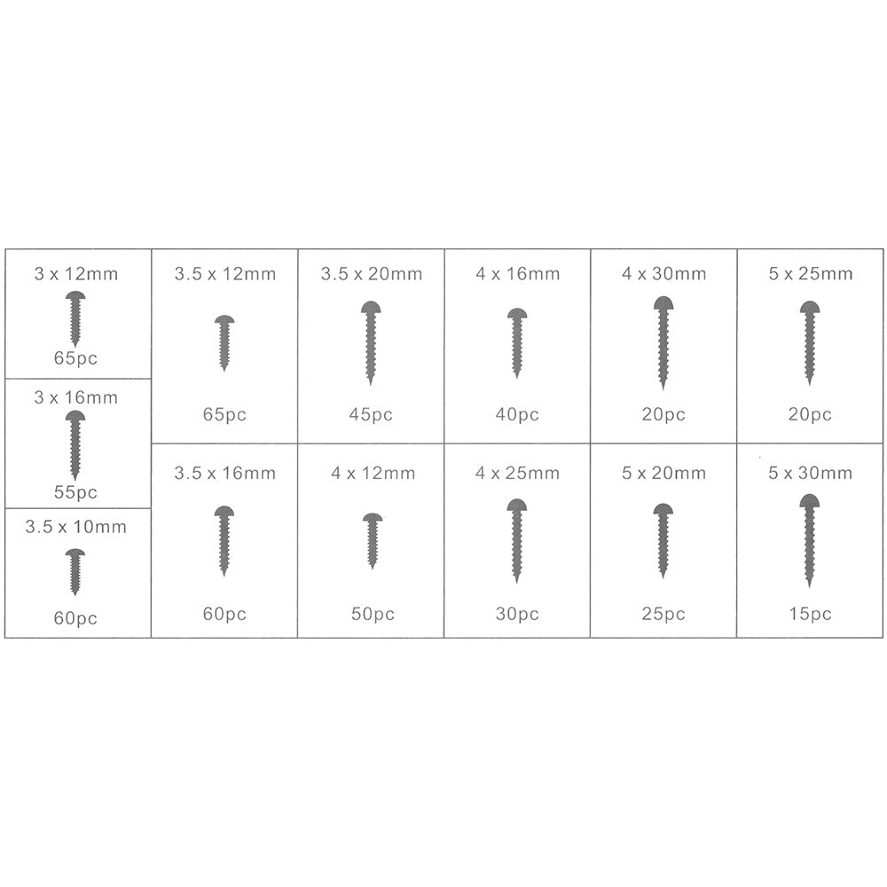 60 @ 3.5 x 16mm, 45 @ 3.5 x 20mm, 50 @ 4 x 12mm, 40 @ 4 x 16mm