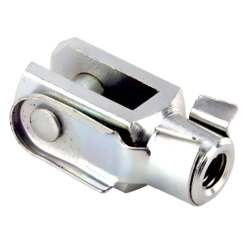 This plated steel clevis pin features a 5mm diameter hardened pin, secured with a spring-clip retainer, and an M5 female thread. Ideal for various applications requiring a secure and reliable connection.