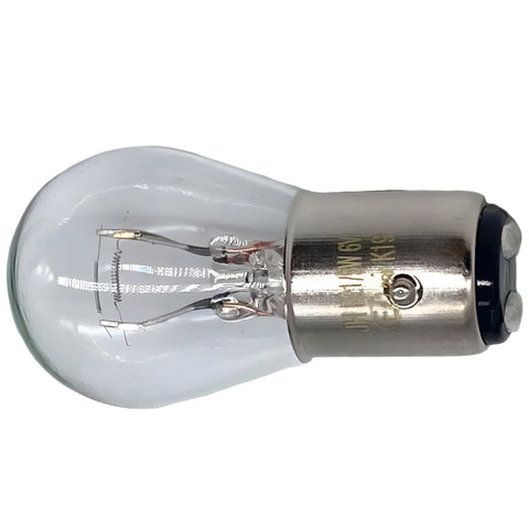 This 6 Volt twin filament bulb offers both 21 watts and 5 watts of power, making it a versatile choice for various applications. It features a 15mm cap with double contacts and staggered bayonet pins for secure and reliable connection.