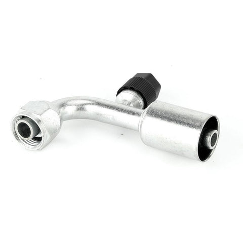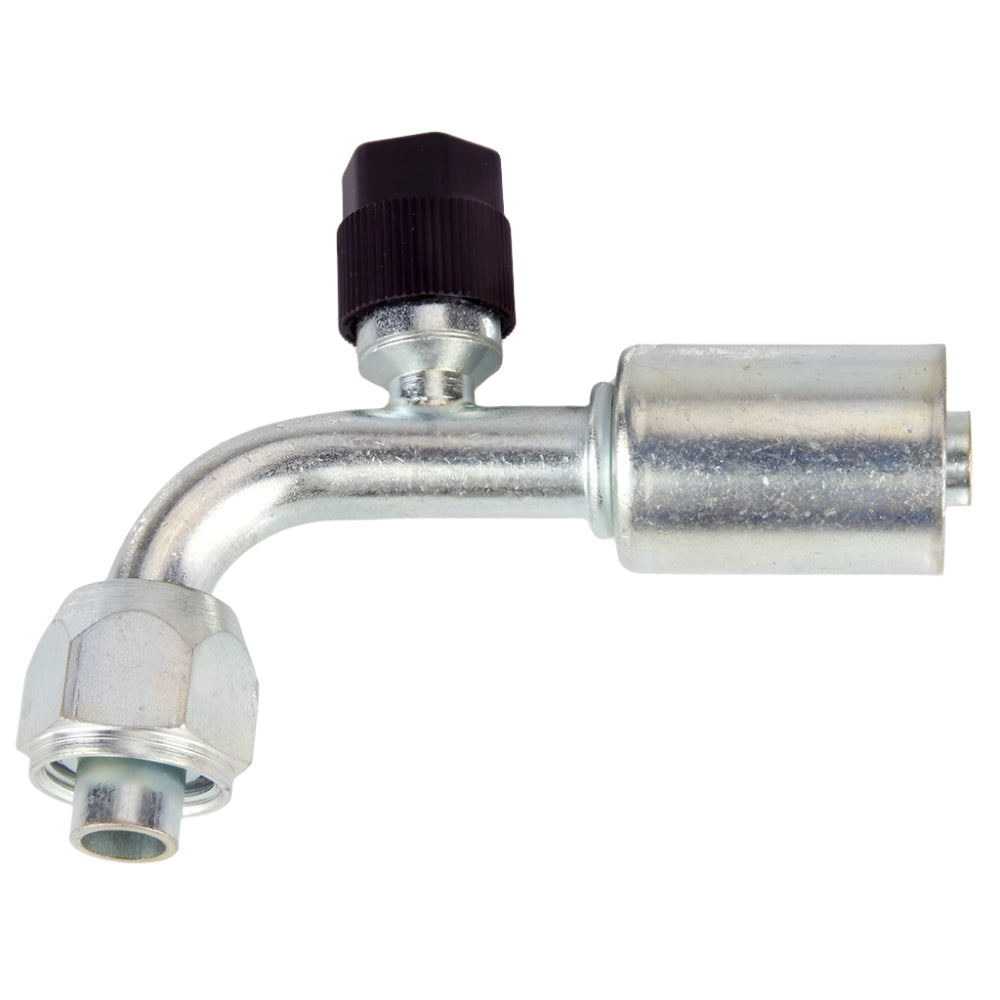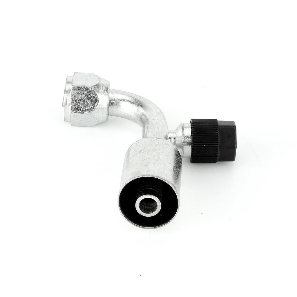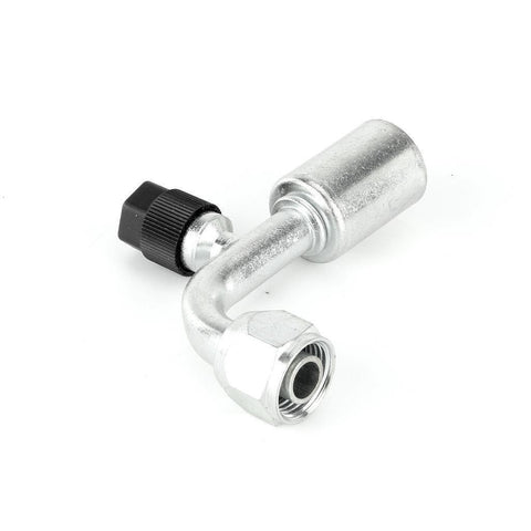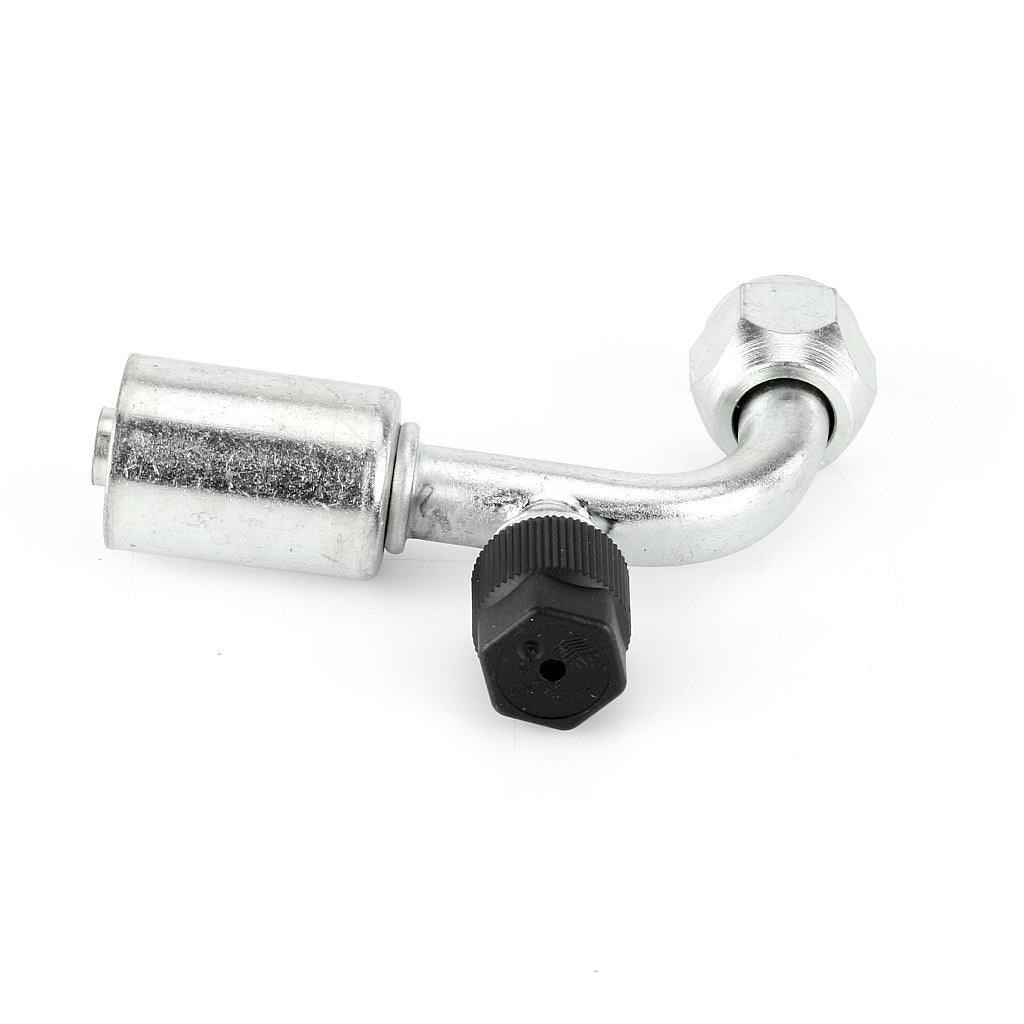 This 90-degree charging port is designed for air conditioning systems and includes an 'O' ring for a secure seal. The angled design allows for easier access and connection in tight spaces, making it ideal for various HVAC applications. It is compatible with #8 refrigerant lines and ensures reliable performance.
