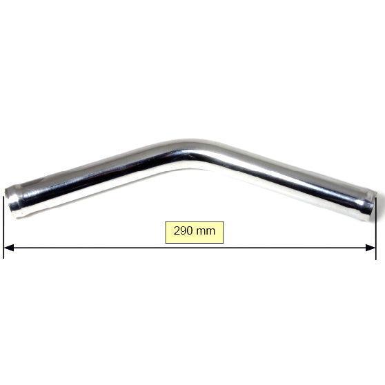 25mm OD aluminium bend, 45-degree angle, 1.5mm wall, 6063-grade, mandrel bent, beaded ends, 290mm length.