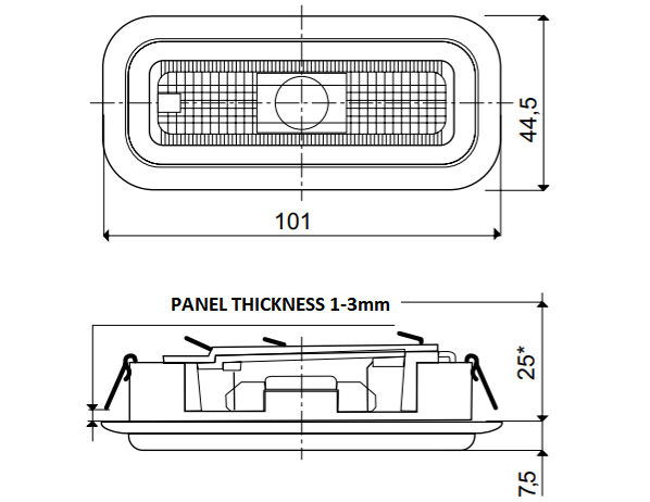 This compact 100mm black interior light offers versatile installation options. Its rocker switch lens allows for easy on/off control, or it can be connected to door switches for automatic illumination. The light requires a simple 87mm x 29mm cut-out for installation and comes complete with a 7-watt festoon bulb.