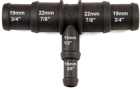 Durable nylon stepped T piece connector for joining 19/22mm and 13/10mm hoses. Resistant to chemicals and suitable for various applications.