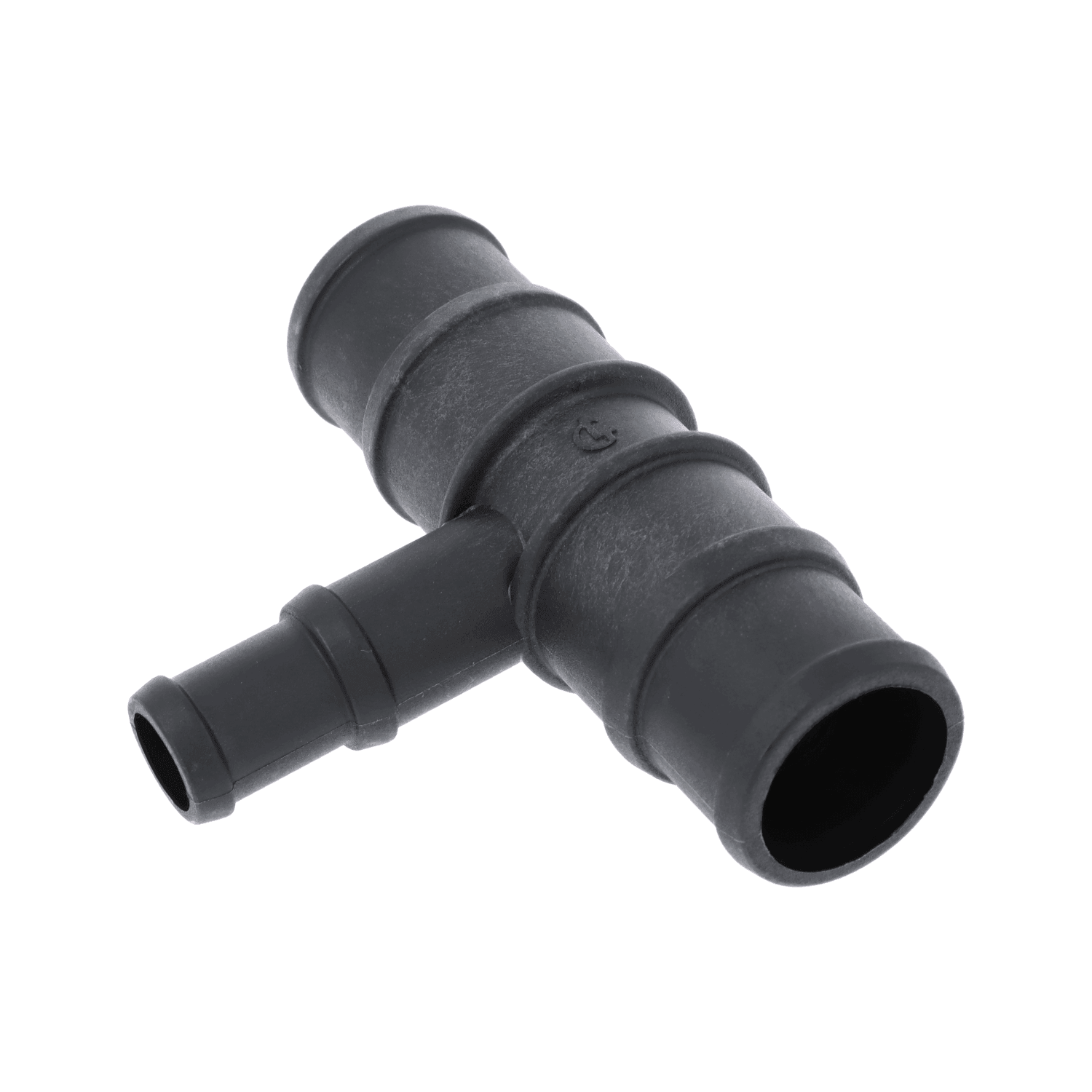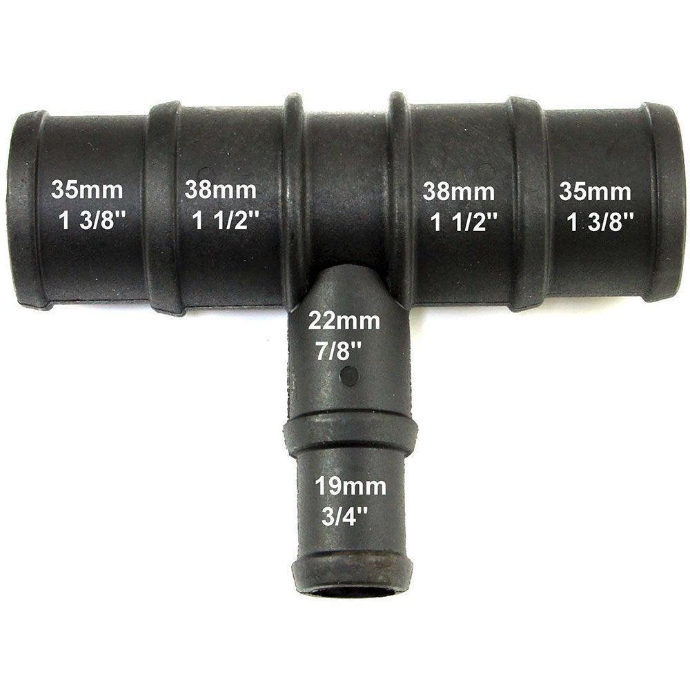 This stepped T piece connector is ideal for joining hoses and pipes of different diameters. Made from durable black nylon, it's suitable for a variety of applications, including automotive, industrial, and domestic use. Its stepped design allows for a secure connection between 35/38mm and 22/19mm pipes, ensuring a leak-free seal. Perfect for use with LPG, oil, fuel, and coolant systems, offering reliable performance in demanding environments.