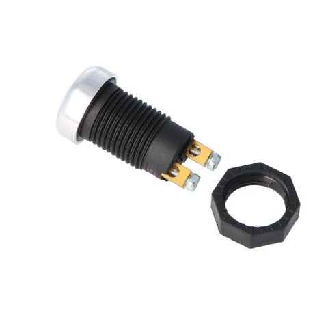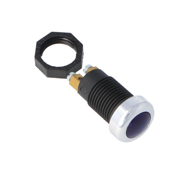 These large diameter warning lights have a 22mm diameter screw on bezel with a dash projection of 9mm, the rear projection of the light body is 36mm, mounting through a 17mm hole with a maximum panel thickness of 14mm. Screw terminals on the rear and a threaded collar to secure it to the dashboard. This warning light also includes a 2w Bulb.