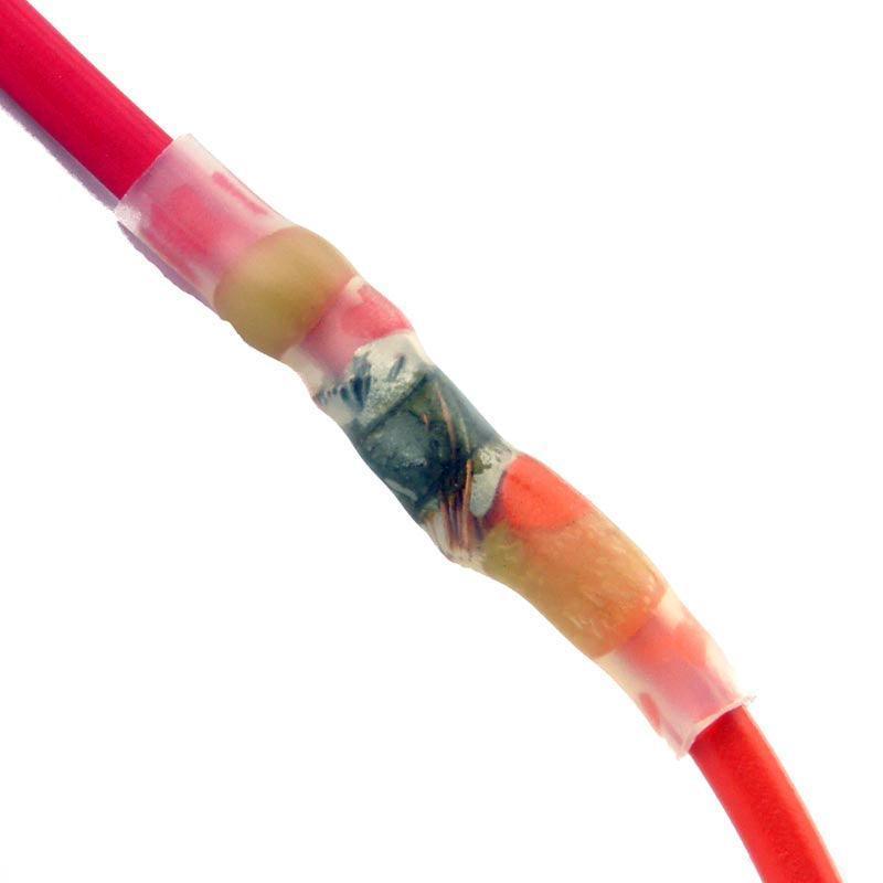 The solder will melt to join the copper strands, the two rings of glue will melt to seal around the cable insulation and the sleeve itself will shrink tightly around the wire for a strong, permanent, weatherproof joint.