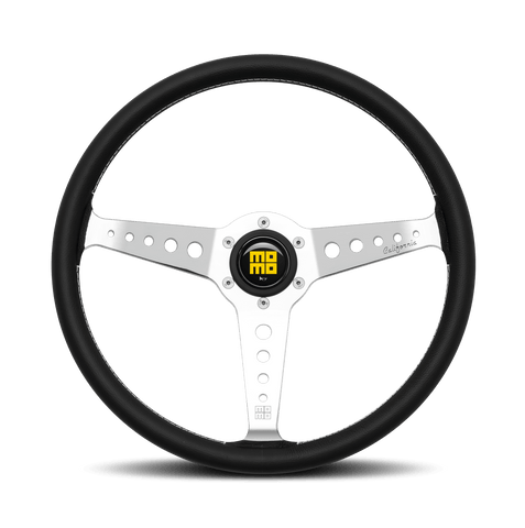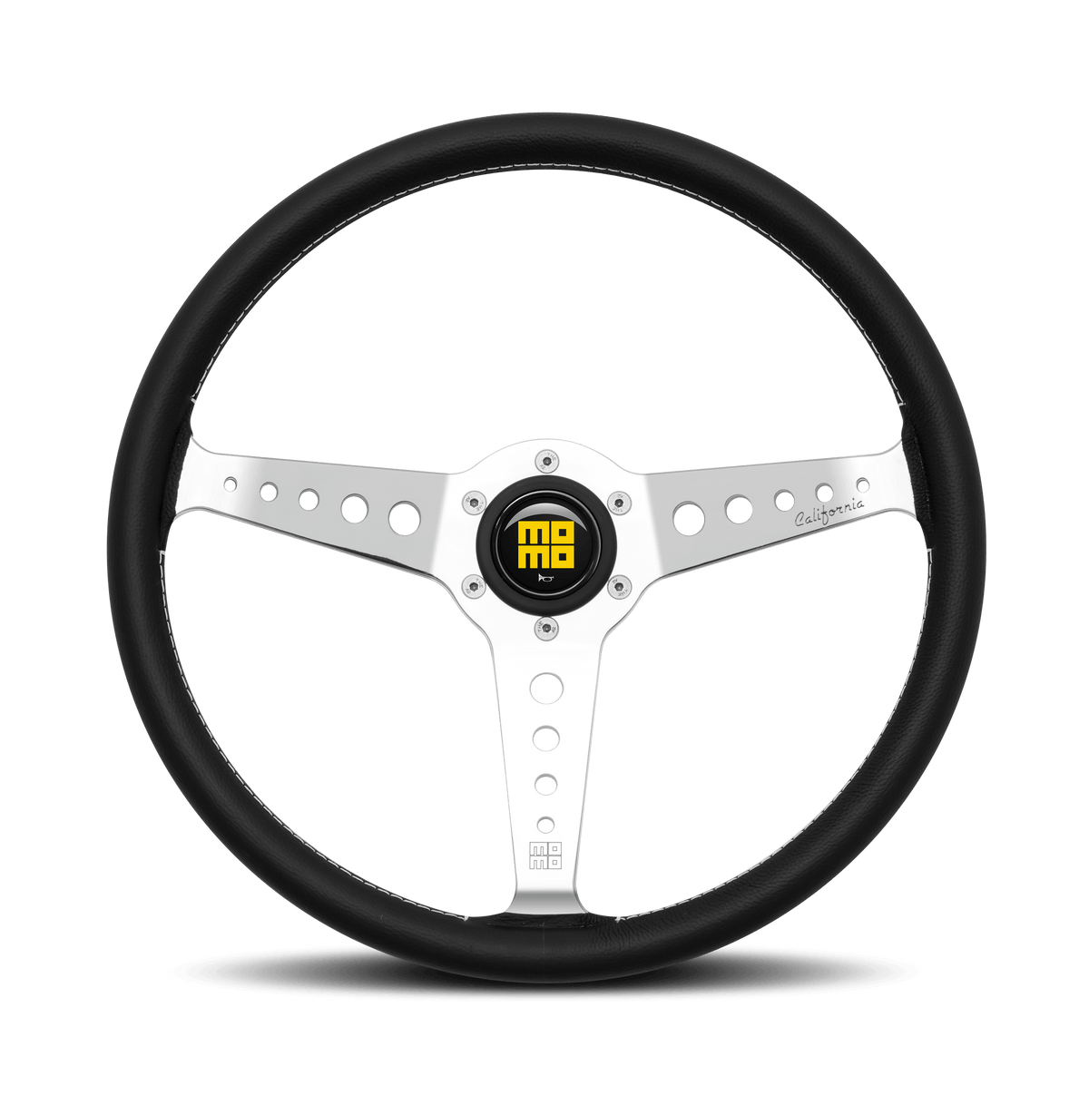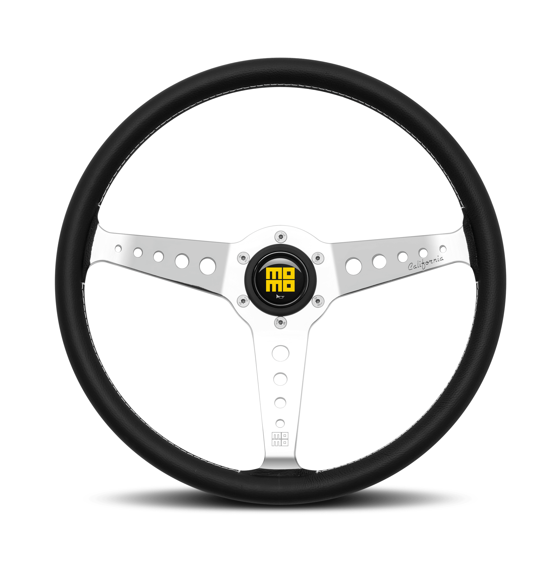 Experience the legacy of MOMO with the California Heritage steering wheel. This classic steering wheel is crafted with black leather, polished chrome spokes, and a heritage logo horn button. It embodies the timeless quality and style of MOMO, harking back to its roots in 1964.