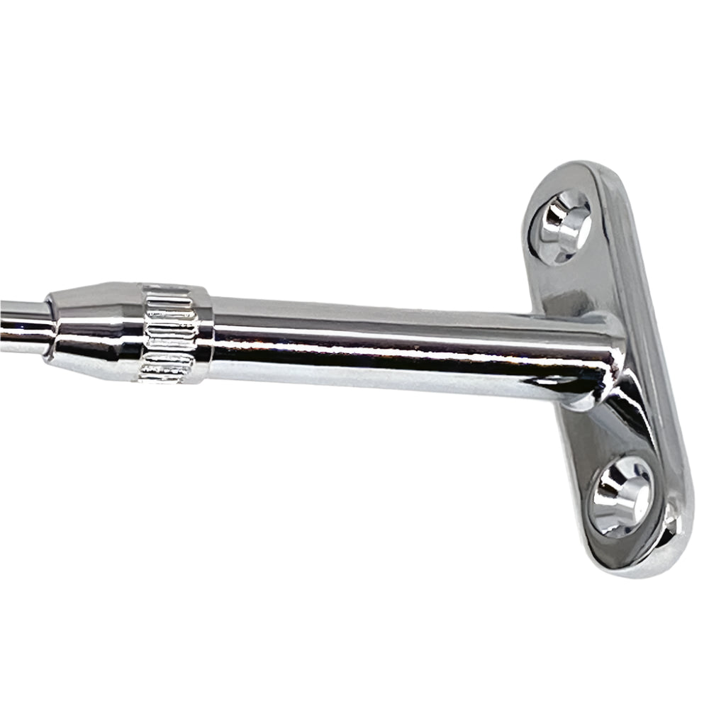 Spherical, floating joint to adjustable chromed mount with base footprint of 57mm x 15mm.