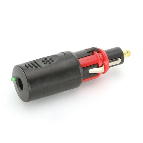 This cleverly designed plug fits both DIN and cigarette lighter sockets. The sliding red cage locks securely in both positions, ensuring a reliable connection. Featuring an 8-amp internal ceramic fuse and a green LED power indicator, this versatile plug offers convenience and safety.