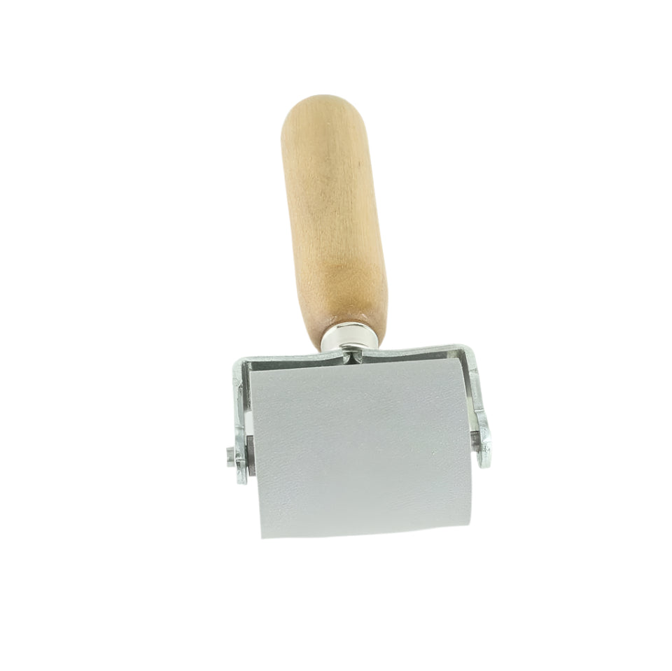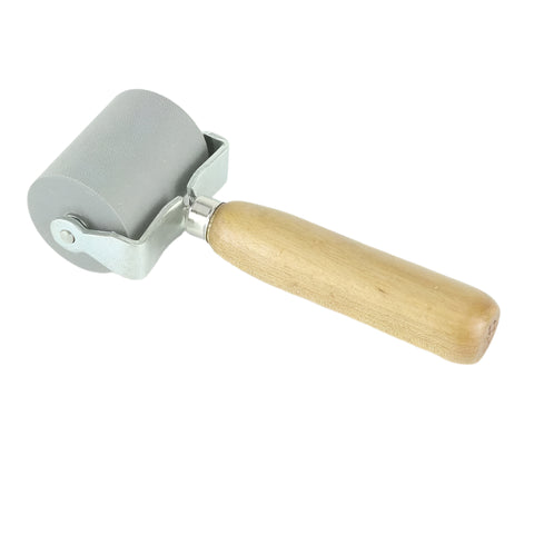 2″ (50mm) wide x 1 1/2" (38mm) diameter, solid rubber roller with wooden handle and plated steel frame and pin.