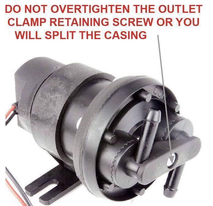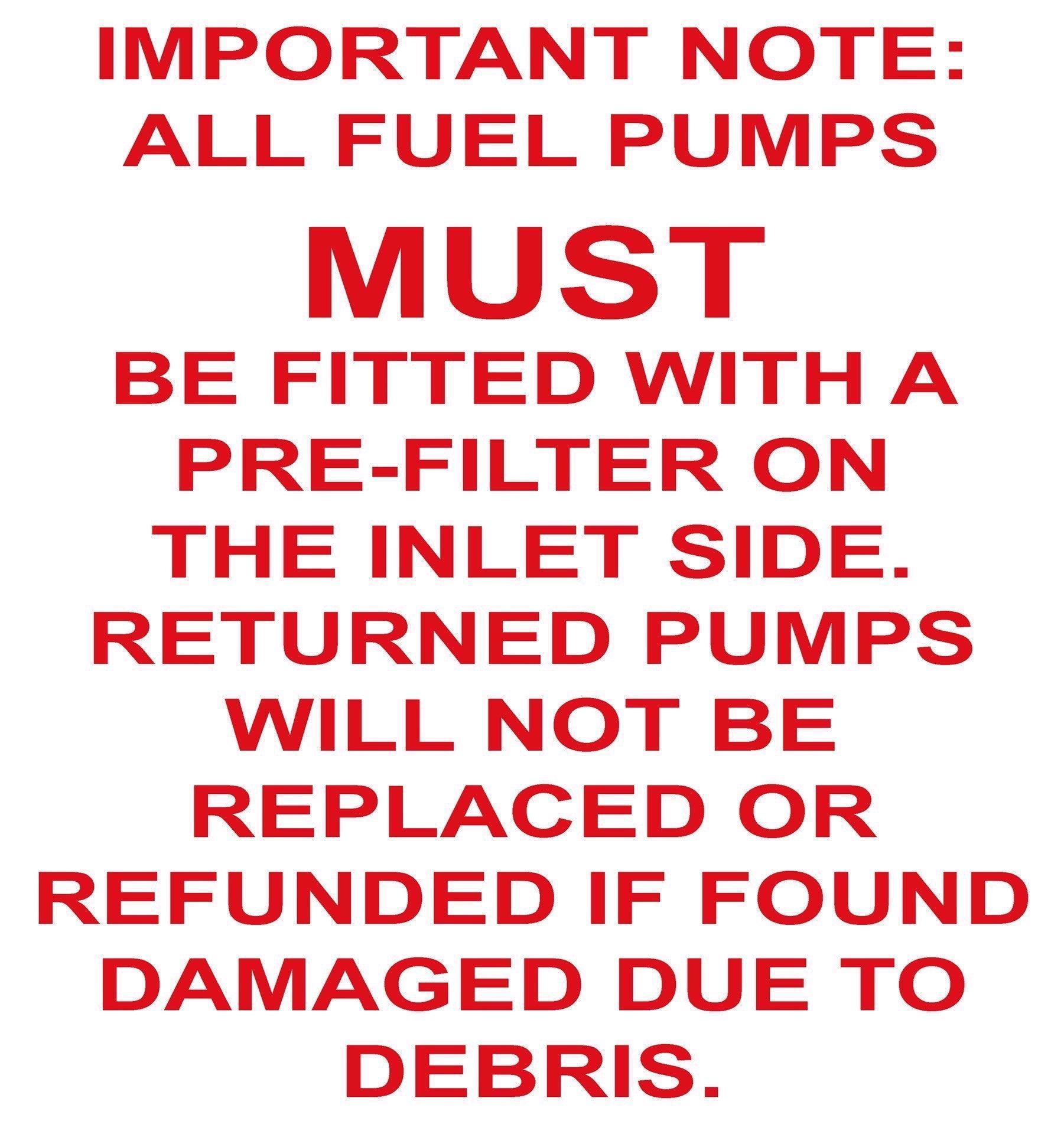 IMPORTANT NOTE: ALL FUEL PUMPS MUST BE FITTED WITH A PRE-FILTER ON THE INLET SIDE. RETURNED PUMPS WILL NOT BE REPLACED OR REFUNDED IF FOUND DAMAGED DUE TO DEBRIS.