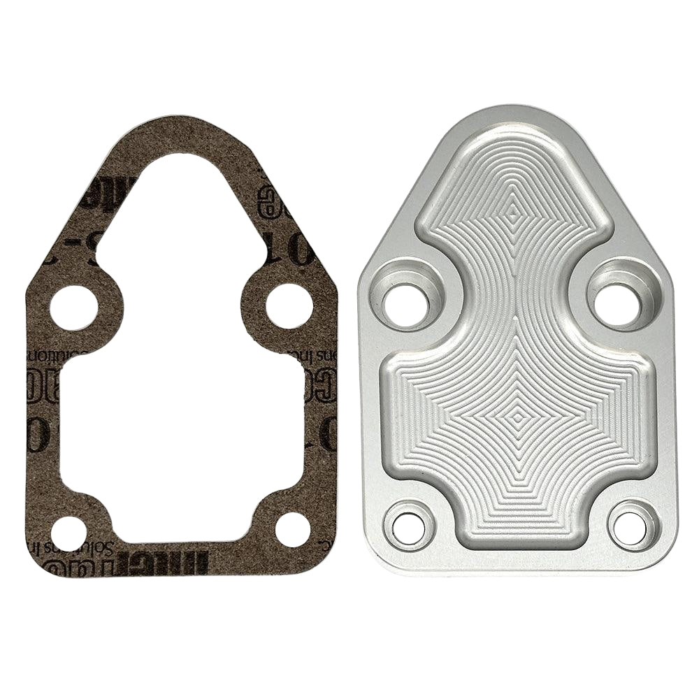 This beautifully cnc’d aluminium cover will seal the hole in the engine block if you are converting from a mechanical pump to an electric pump.