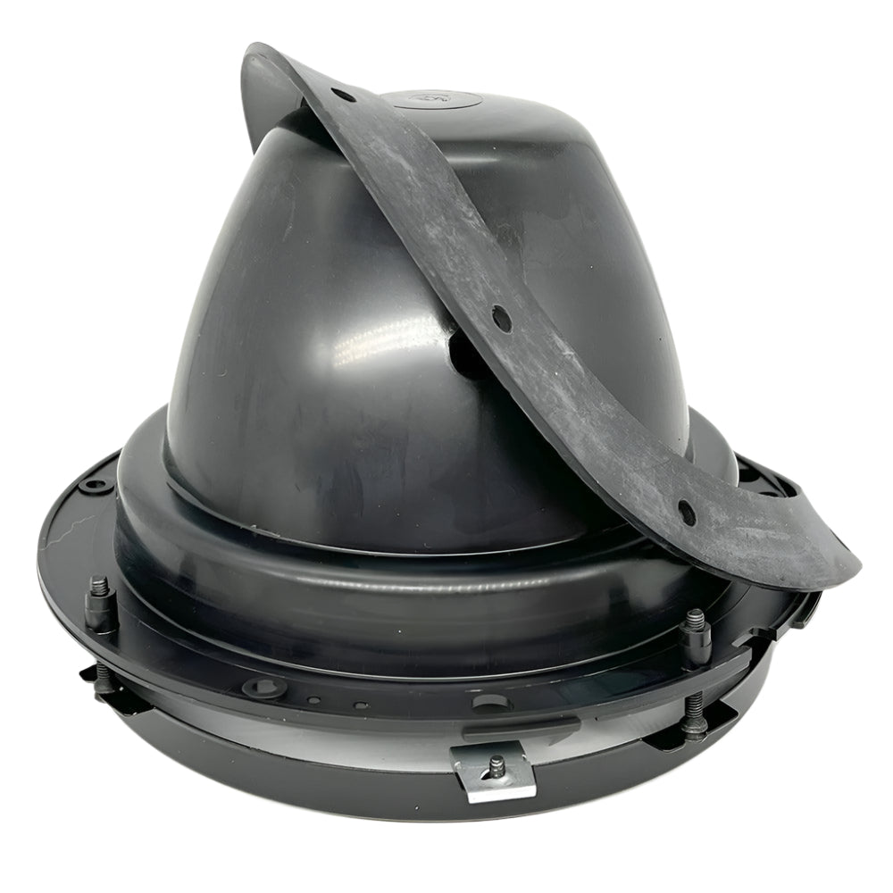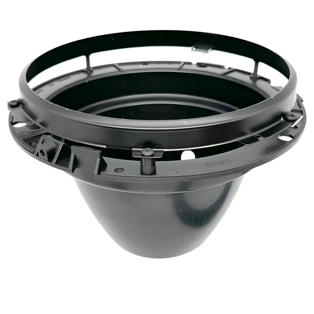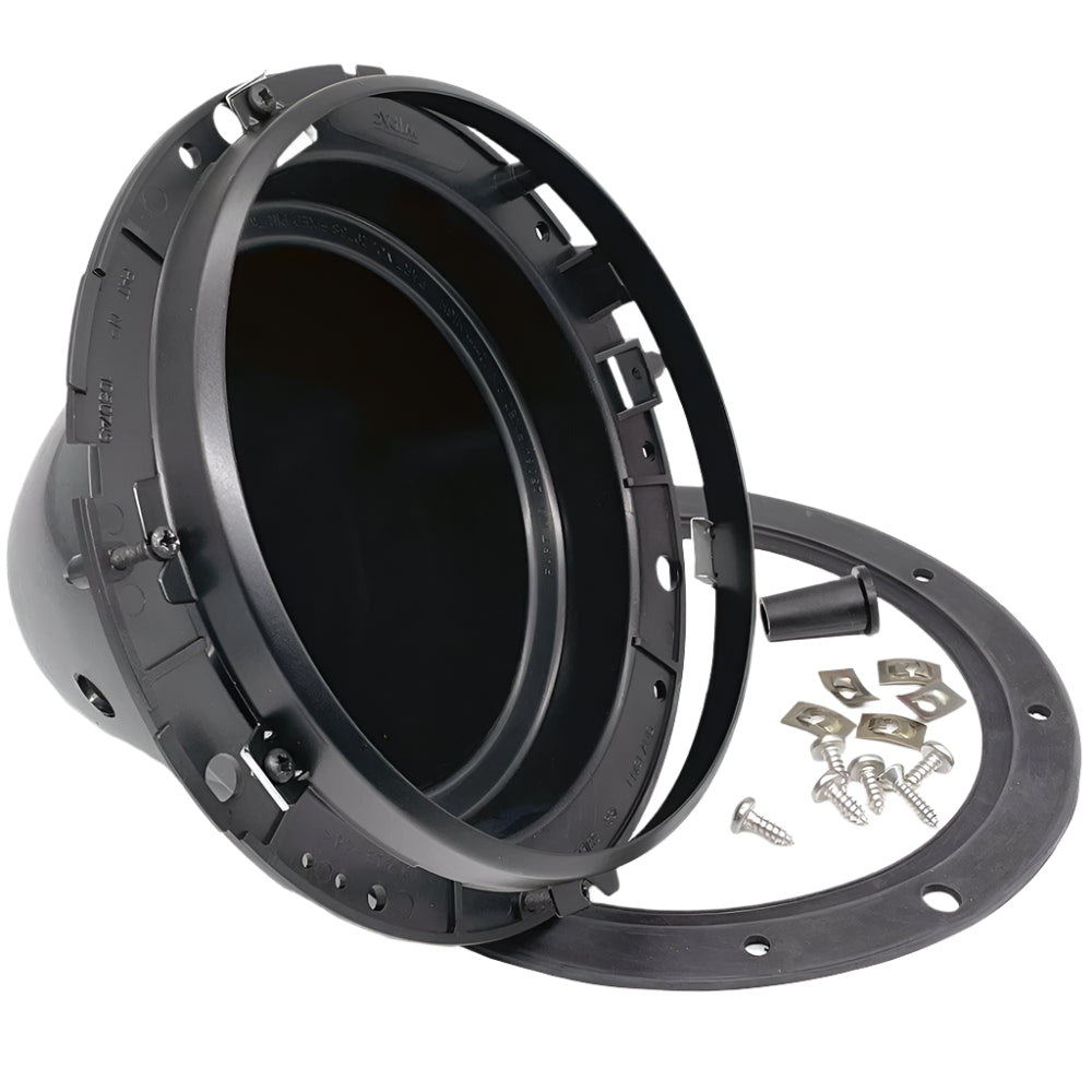This 7" headlamp bowl is crafted from moulded plastic with a durable black coated metal lamp ring. It includes a grommet and rubber gasket for a secure and weather-resistant fit. The bowl fits a 160mm diameter hole and has overall dimensions of 203mm diameter x 130mm front to back. All necessary mounting, adjuster screws, and plates are included for easy installation.