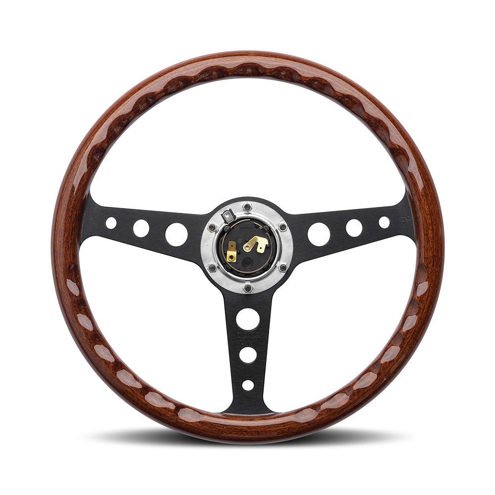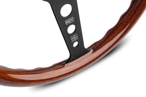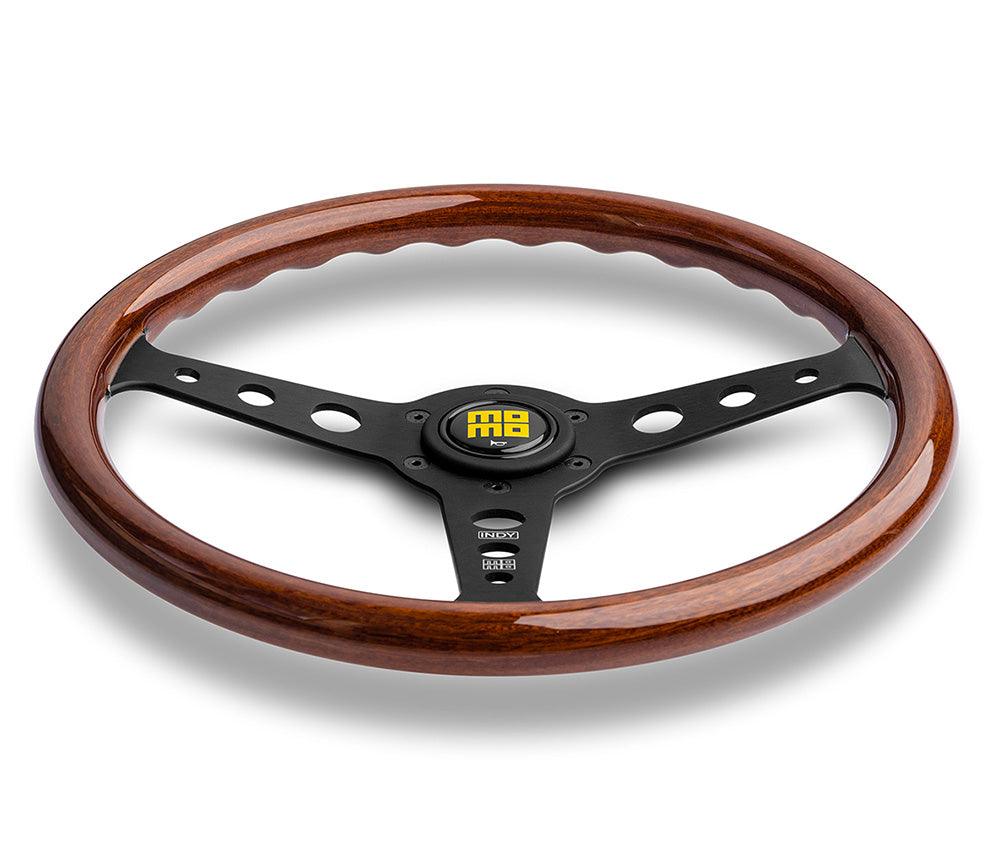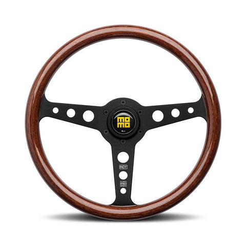 Experience the legacy of MOMO with the Indy Heritage steering wheel. This classic 350mm wooden steering wheel is crafted from beautiful mahogany wood with a glossy finish, accented by black aluminium spokes. The iconic Heritage MOMO logo on the horn button adds a touch of authenticity. Reflecting MOMO's heritage since 1964, this wheel exudes class, quality, and style.