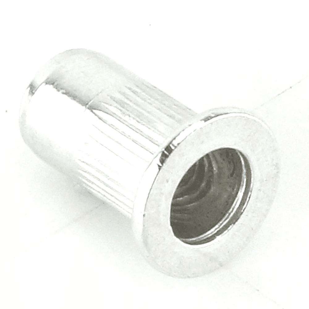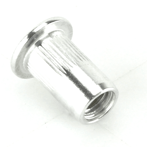 These M5 flat head aluminium rivnuts are ideal for creating strong, reliable threaded inserts in various materials. Each rivnut is 14.3mm long and designed to fit snugly through a 6.5mm hole. The 10mm diameter head features a 1mm deep shoulder, and they are suitable for panels up to 2mm thick.