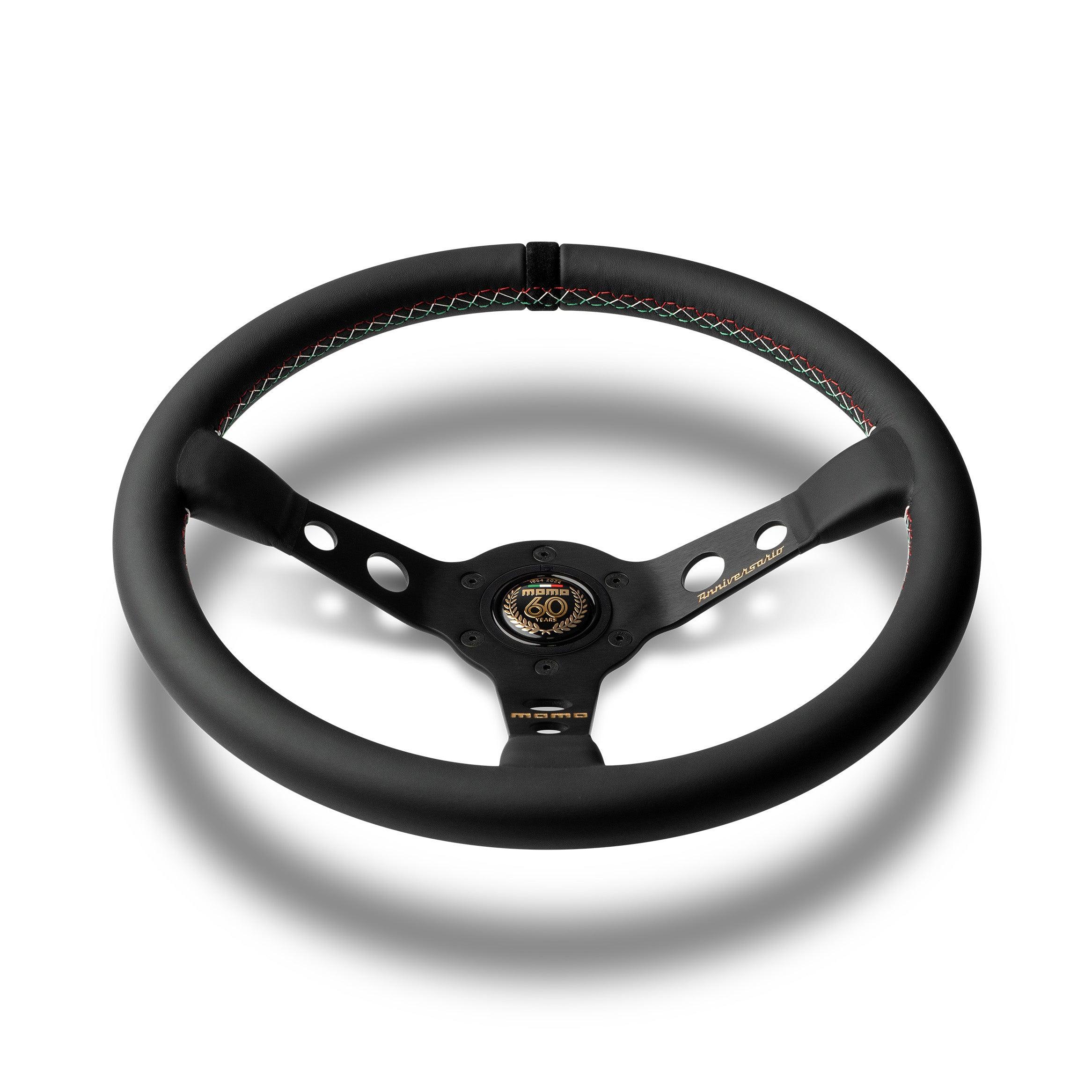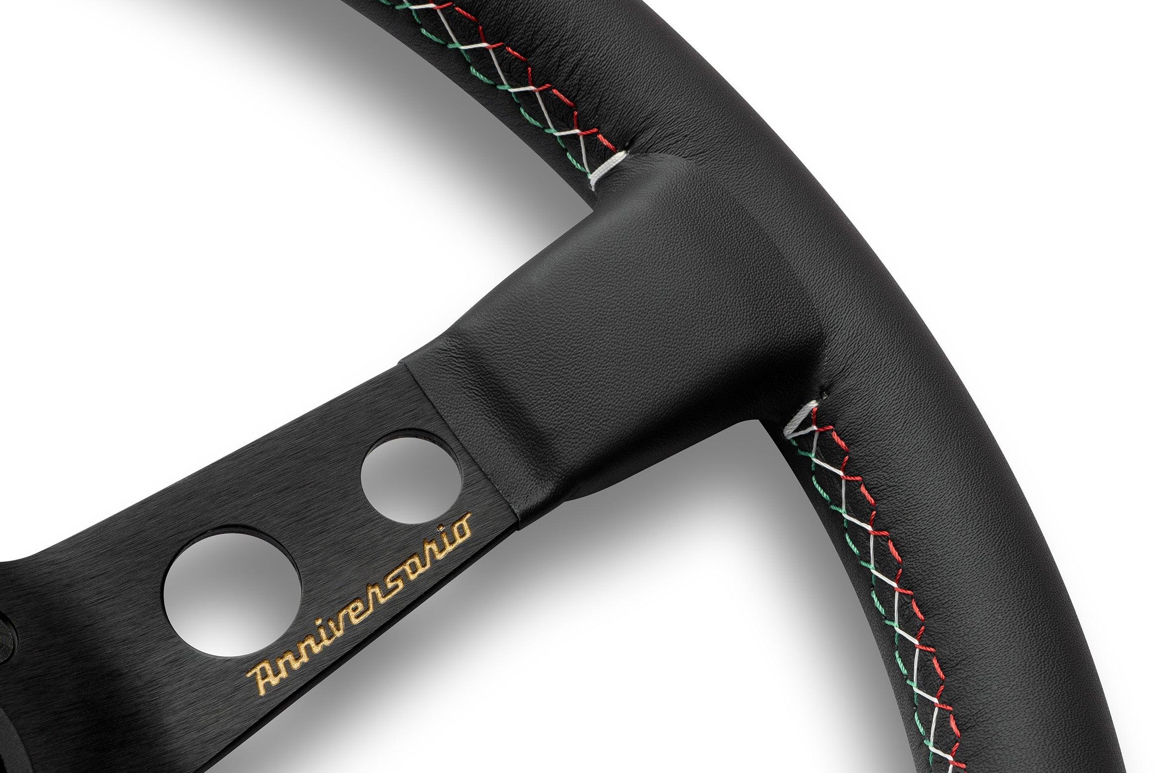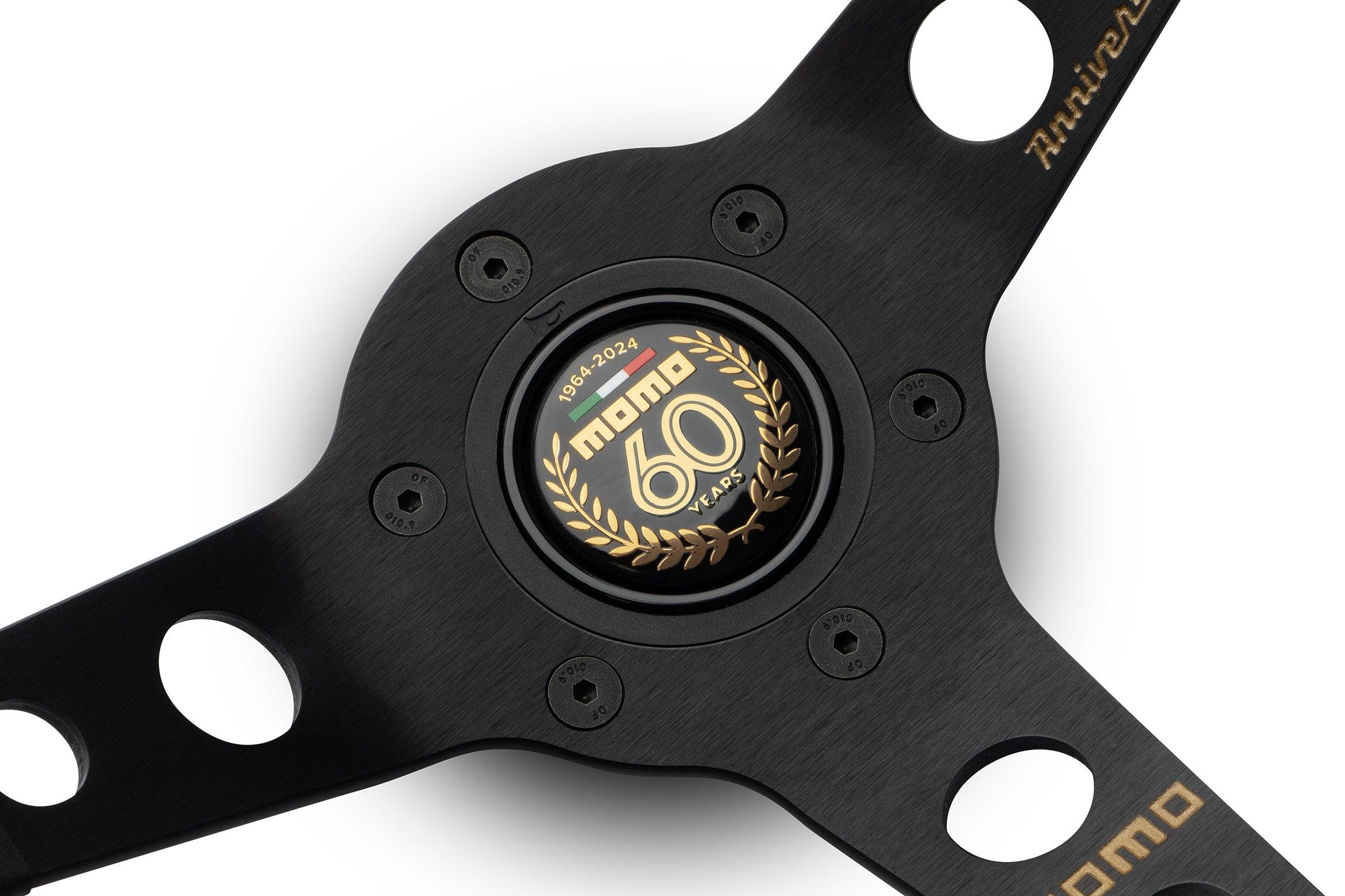 Celebrate 60 years of MOMO with the limited edition MOD.07 Anniversary Steering Wheel. Crafted from premium Italian black leather, this 350mm wheel boasts black aluminium spokes with gold "Anniversario" and MOMO logos. The Italian flag colours are hand-stitched onto the rim, complemented by a black and gold horn button with the 60th-anniversary logo.