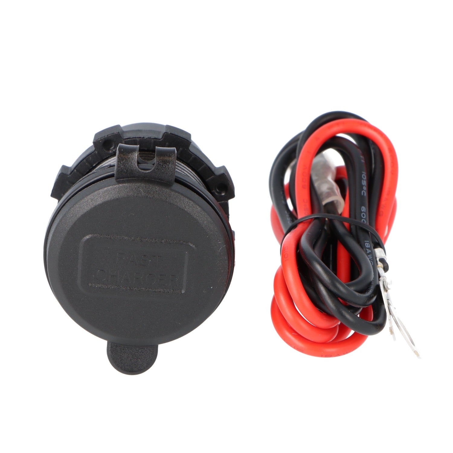 600mm long Red and Black wires with spade terminals and ring terminals and an inline fuse holder and 10 Amp fuse.