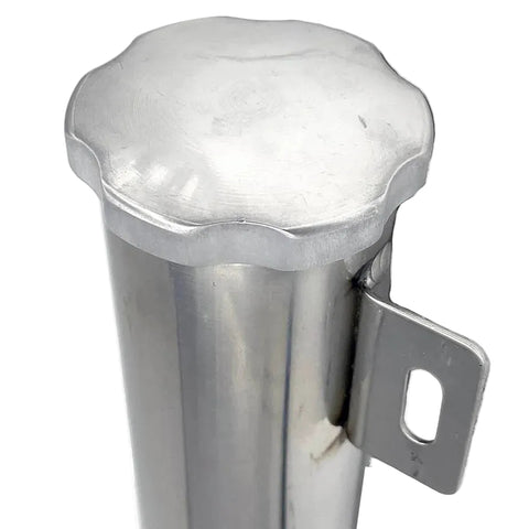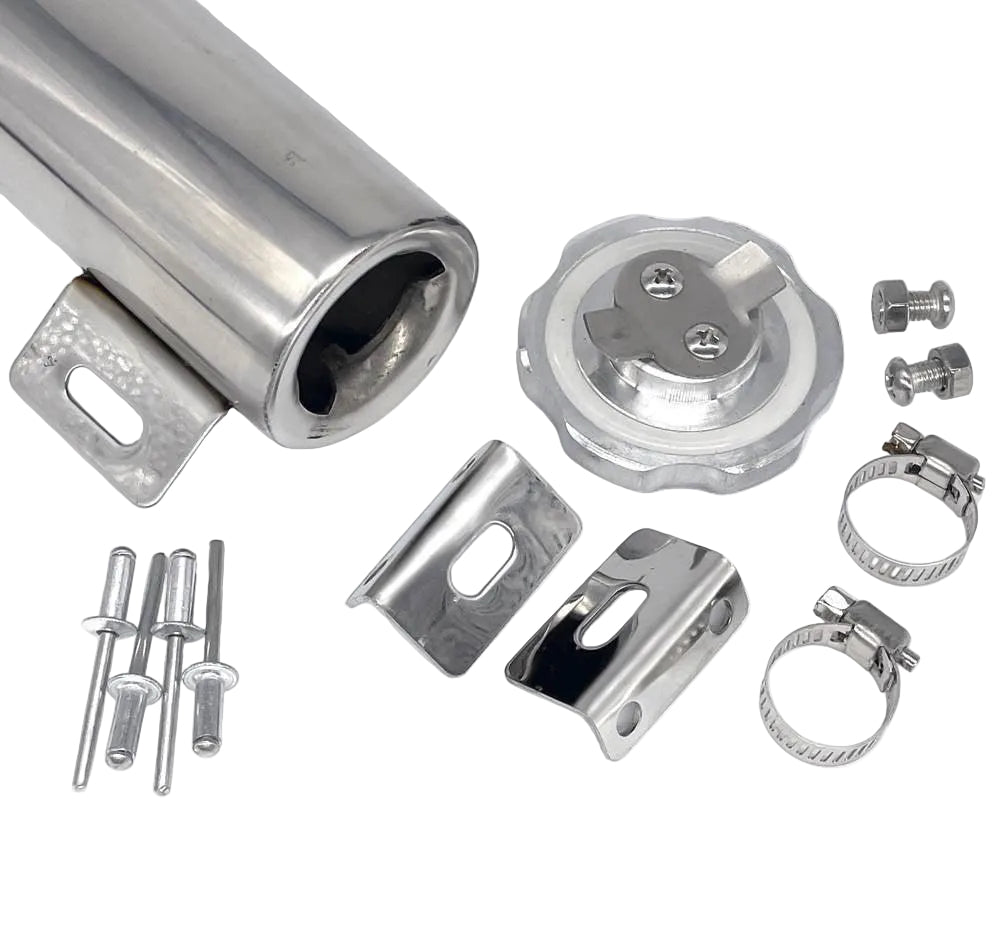 It has a machined, billet aluminium cap with a viton seal, two mounting brackets with rivets and stainless screws.