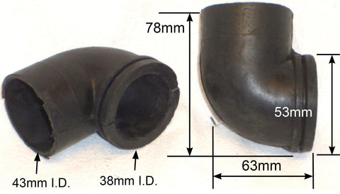 This 40mm rubber heater ducting elbow provides a tight 90-degree bend for your ventilation ducting. One end has a 38mm inner diameter (ID) with a groove designed to fit snugly into a 45mm hole in a bulkhead or airbox up to 2mm thick. The other end has a 43mm ID.