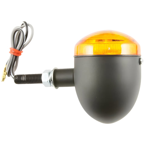 These satin black bullet stalk indicators are crafted with an all-metal construction and feature a removable amber lens. The head measures 49mm in diameter and 69mm in length, while the stem is 16mm long plus an M8 x 33mm mounting stud complete with nut and washers. 12V/21W bulbs are included, along with 160mm flyleads.