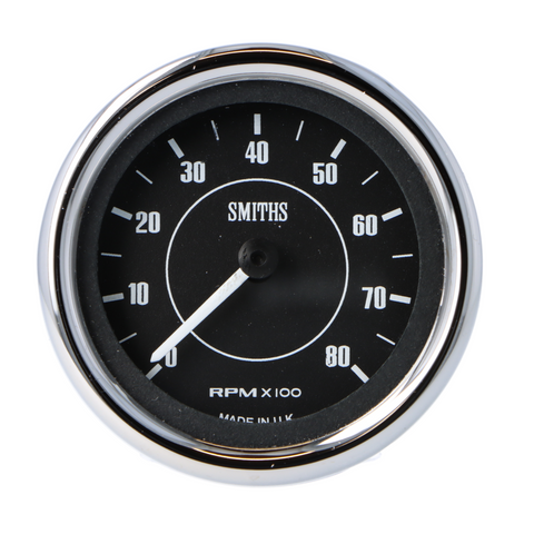 Smiths Classic 52mm tachometer blends vintage style with modern digital accuracy. Features 8K RPM range, adjustable cylinders, and chrome bezel.