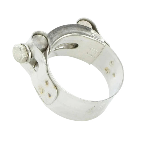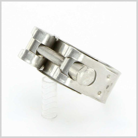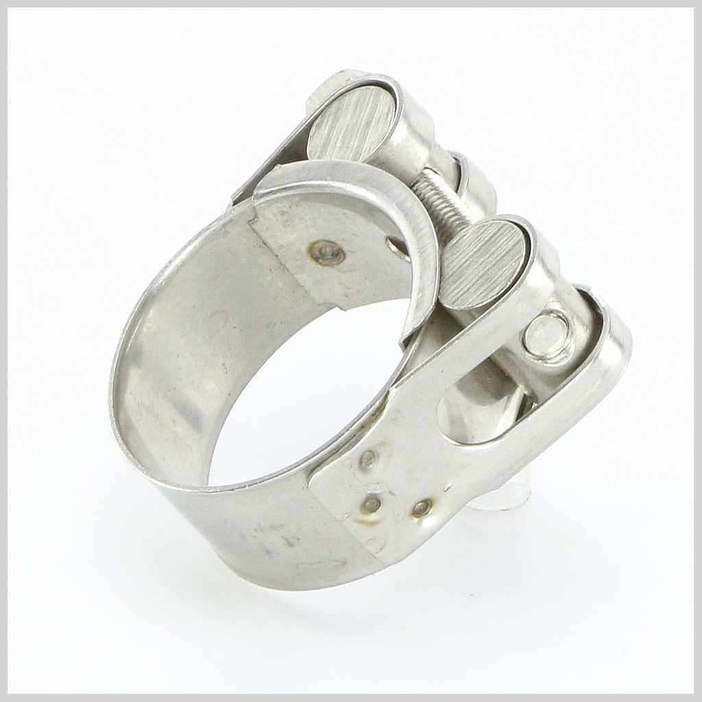 Wide band stainless steel exhaust clamps, solid stainless construction with drilled and tapped ferrules, not to be confused with the cheaper pressed versions. These have rolled edges across the band so will not damage hose or pipe making them also suitable for silicone and rubber hoses.