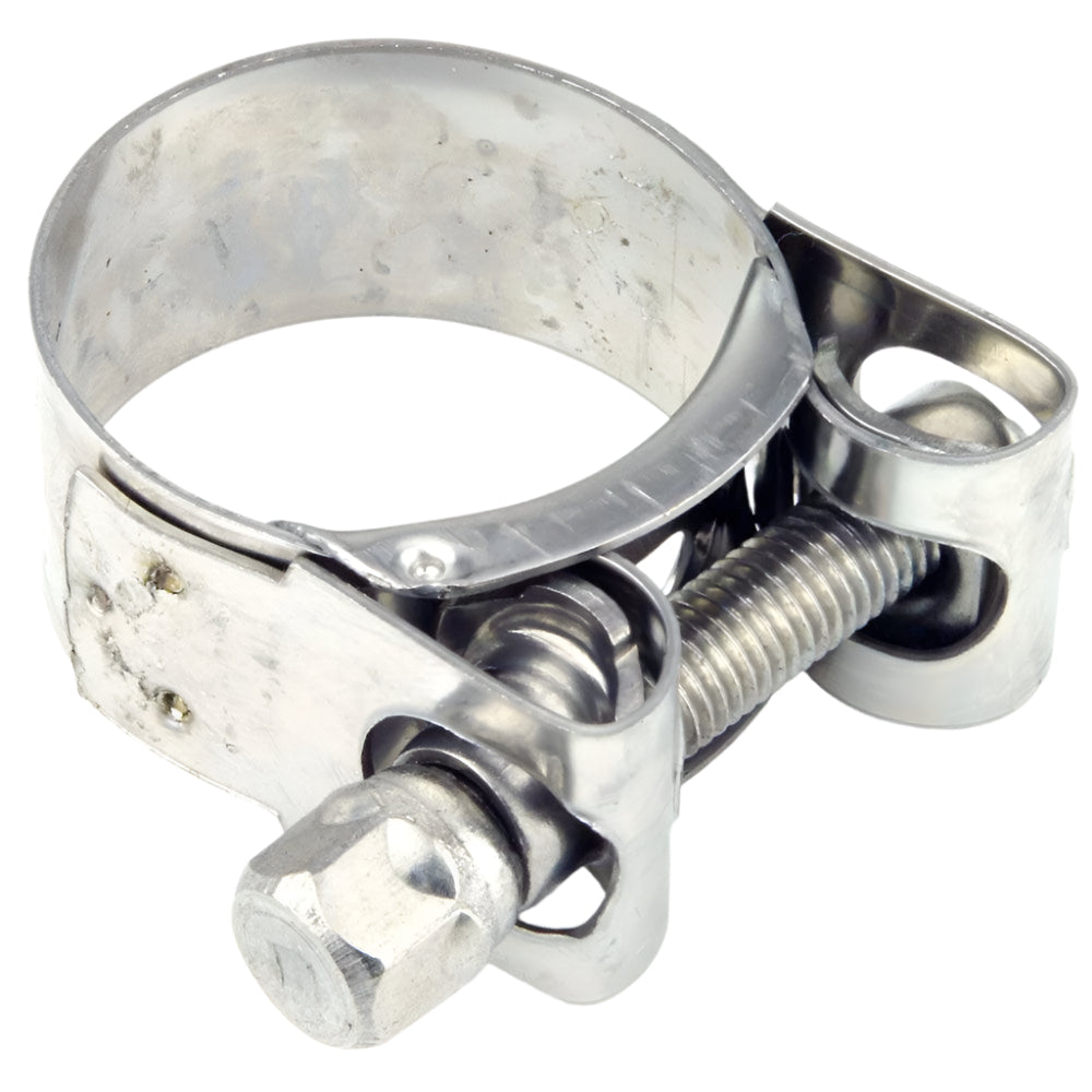 Heavy-duty 'Mikalor' Clamp. 360 degree, even clamping pressure all around your hose or pipe.