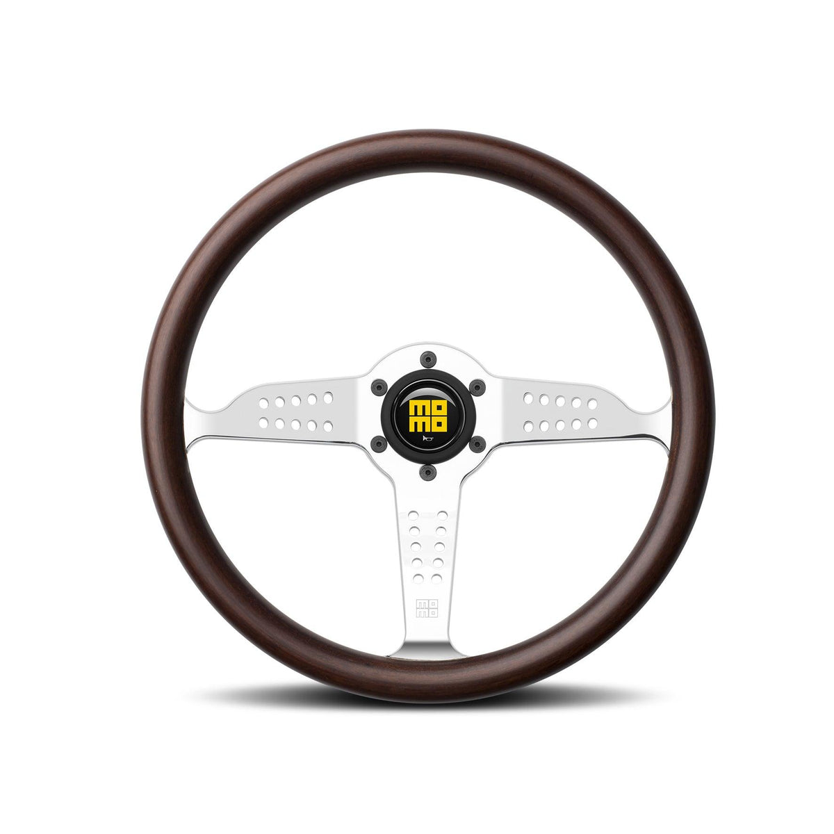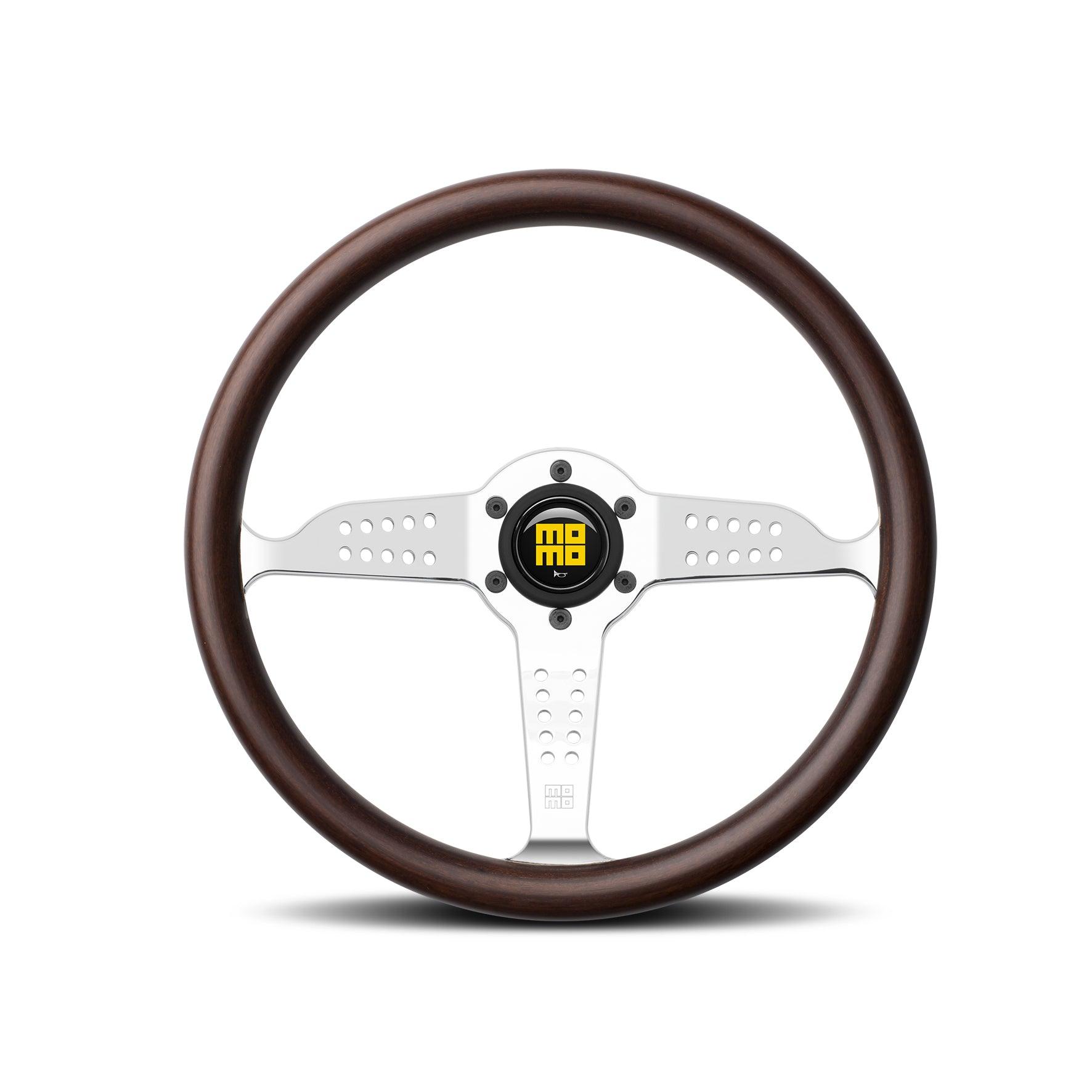 Experience the legacy of MOMO with the Super Grand Prix steering wheel. This classic wooden steering wheel, crafted from beautiful mahogany wood with a semi-matte finish, embodies MOMO's heritage dating back to 1964. The polished chrome aluminium spokes and Heritage MOMO Logo on the horn button add a touch of timeless elegance.