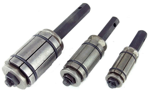 These three tail pipe expanders are designed to straighten out any dents made by exhaust clamps in the end of a thin-wall (up to 1mm), steel or aluminium (not stainless) exhaust or tail pipe, from the inside.